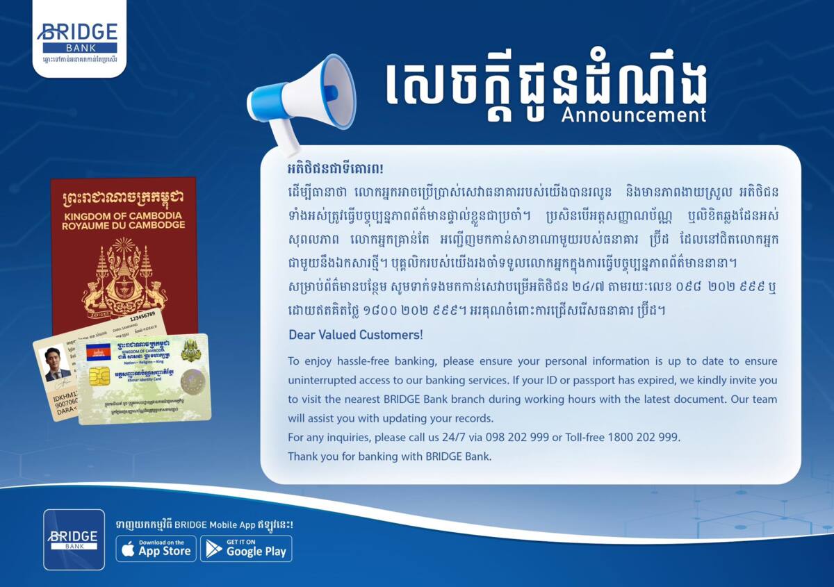 To enjoy hassle-free banking, please ensure your personal information is up to date to ensure uninterrupted access to our banking services. If your ID or passport has expired, we kindly invite you to visit the nearest BRIDGE Bank branch during working hours with the latest document. Our team will assist you with updating your records. For any inquiries, please call us 24/7 via 098 202 999 or Toll-free 1800 202 999. Thank you for banking with BRIDGE Bank.