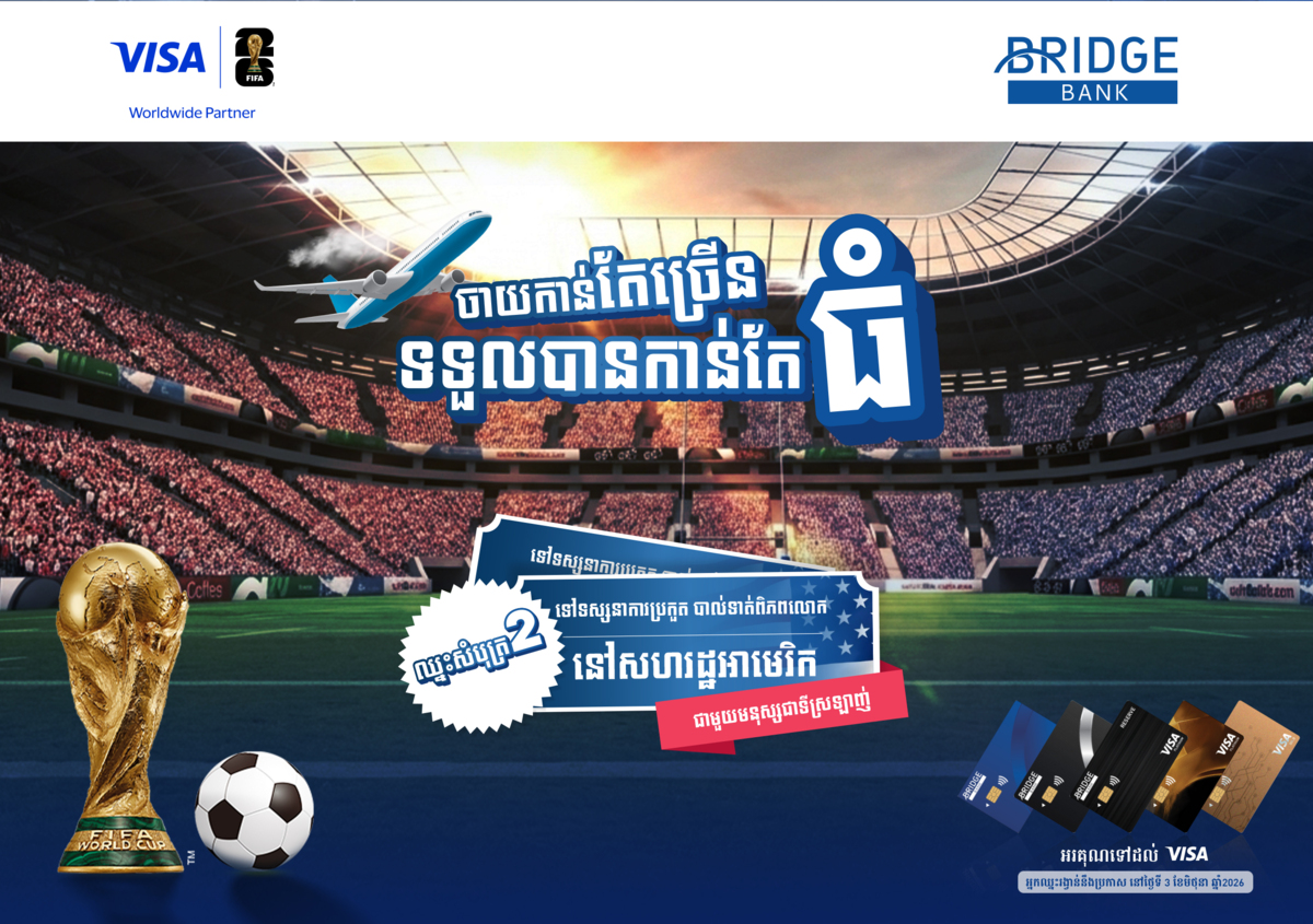 ព្រឹត្តិការណ៍ FIFA World Cup 2026™ កំពុងតែខិតជិតមកដល់ហើយ ហើយធនាគារ BRIDGE កំពុងផ្ដល់ឱកាសពិសេសដ៏អស្ចារ្យមួយសម្រាប់អតិថិជនដែលប្រើប្រាសកាតវីសាគ្រប់ប្រភេទ ដើម្បីបានចូលរួមទស្សនាព្រឹត្តិការណ៍បាល់ទាត់ដ៏ធំបំផុតនៅលើពិភពលោកដោយផ្ទាល់នៅសហរដ្ឋអាមេរិក។