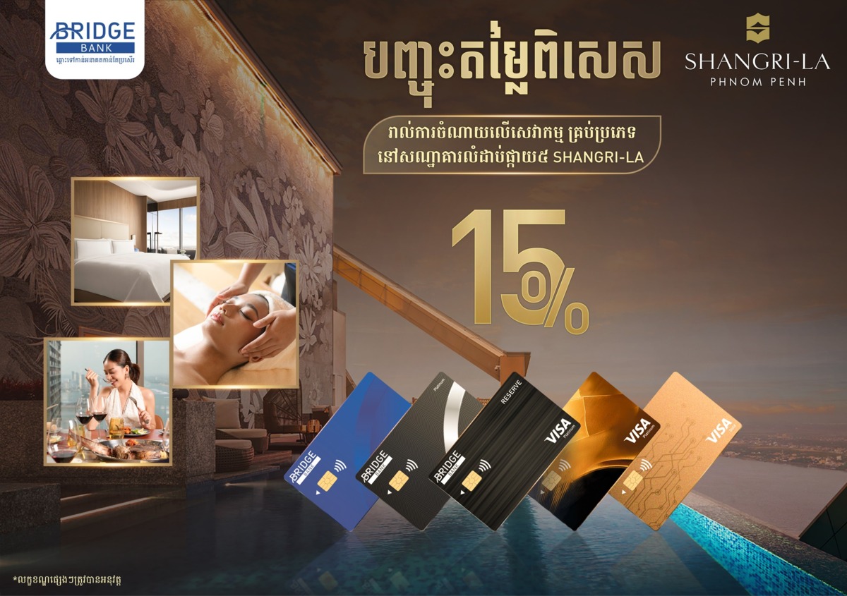 ការផ្តល់ជូនពិសេសសម្រាប់អតិថិជន ដៃគូរ​ និងបុគ្គលិករបស់ធនាគារប្រ៊ីដ! ចាប់ពីថ្ងៃផ្សាយដំណឹងនេះតទៅ លោកអ្នកគ្រាន់តែប្រើប្រាស់កាតណាមួយរបស់ធនាគារប្រ៊ីដ លោកអ្នកនឹងទទួលបានការបញ្ចុះតម្លៃរហូតដល់ ១៥% នៅ​ Shangri-La Phnom Penh Hotel ដែលមានទីតាំង ភូមិលេខ ១៤ ផ្លូវសម្តេចហ៊ុនសែន រាជធានីភ្នំពេញ។